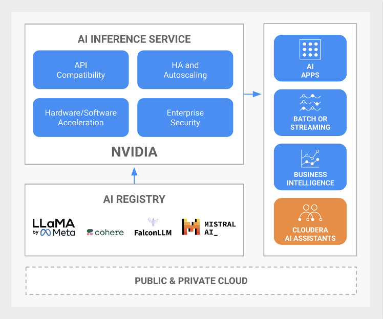 NVIDIA NIM マイクロサービスを採用した Cloudera AI Inference サービスは、オンプレミス環境とクラウド環境にまたがるシームレスで高性能な AI モデル推論を実現します。オープンソース・コミュニティ・モデル、NVIDIA AI Foundation モデル、カスタム AI モデルをサポートし、多様なビジネスニーズに対応する柔軟性を提供します。このサービスは、プライバシーとセキュリティに重点を置きながら、大規模な生成 AI アプリケーションの迅速な展開を可能にし、本番環境で AI モデルを使用してデータの可能性を最大限に引き出したいと考えている企業をご支援いたします。
