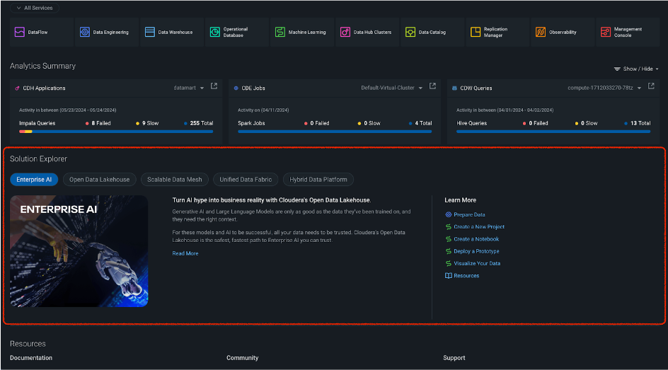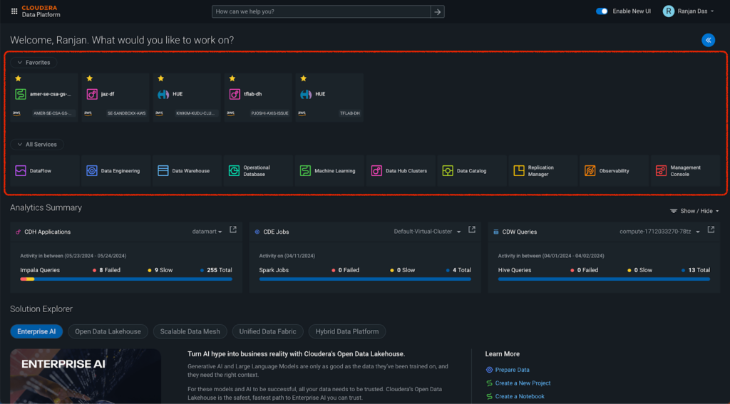 Cloudera の UI を刷新するという決定は、ユーザーエクスペリエンスの向上と、進化するお客様ニーズへ対応するという取り組みによるものです。Cloudera では常にユーザーの声に耳を傾け、その特定の要件を満たすソリューションをカスタマイズしてきました。そして長年にわたり、プラットフォームは機能性を高め、多様なサービスとツールを提供してきました。しかし、従来のタイルベースのホームページは機能的だったものの、ユーザーが必要とする直感的なナビゲーションや素早い情報アクセスを十分にサポートするものではありませんでした。今回の UI の改善により、当社のプラットフォームは最先端かつユーザーフレンドリーなデザインとなり、ユーザーは当社のサービスの潜在能力を最大限に活用できるようになります。